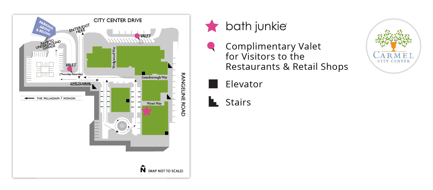 Bath Junkie is located in Carmel City Center, which is in the heart of central Carmel at the southwest corner of Rangeline Road and City Center Drive (126th Street).